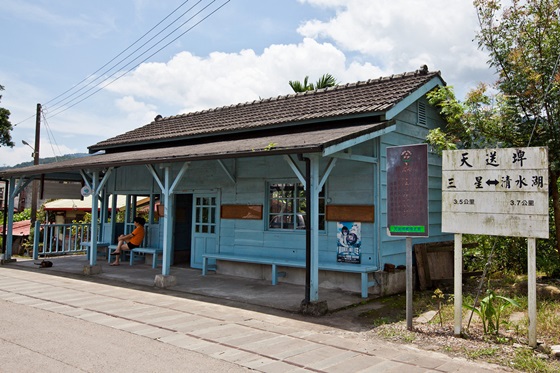 沒有火車經過的天送埤火車站,「下一站?幸福」梁小樂第一次見到外星人爸爸~就是在此拍攝的場景喔!天送火車站創建於1921年,日據時代,太平山因蘊藏著豐富的森林,以生產紅橧、扁柏著稱,為運材需要而設置太平山森林鐵道,由土場至竹林,沿途設車站十處,天送埤車站居中。